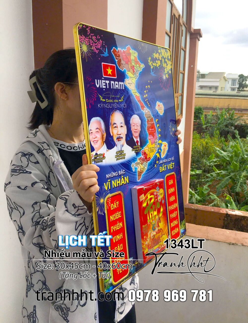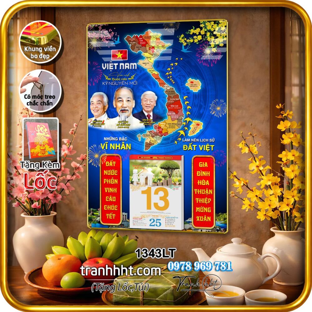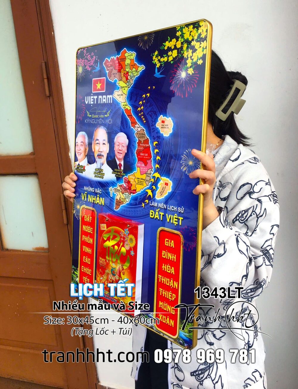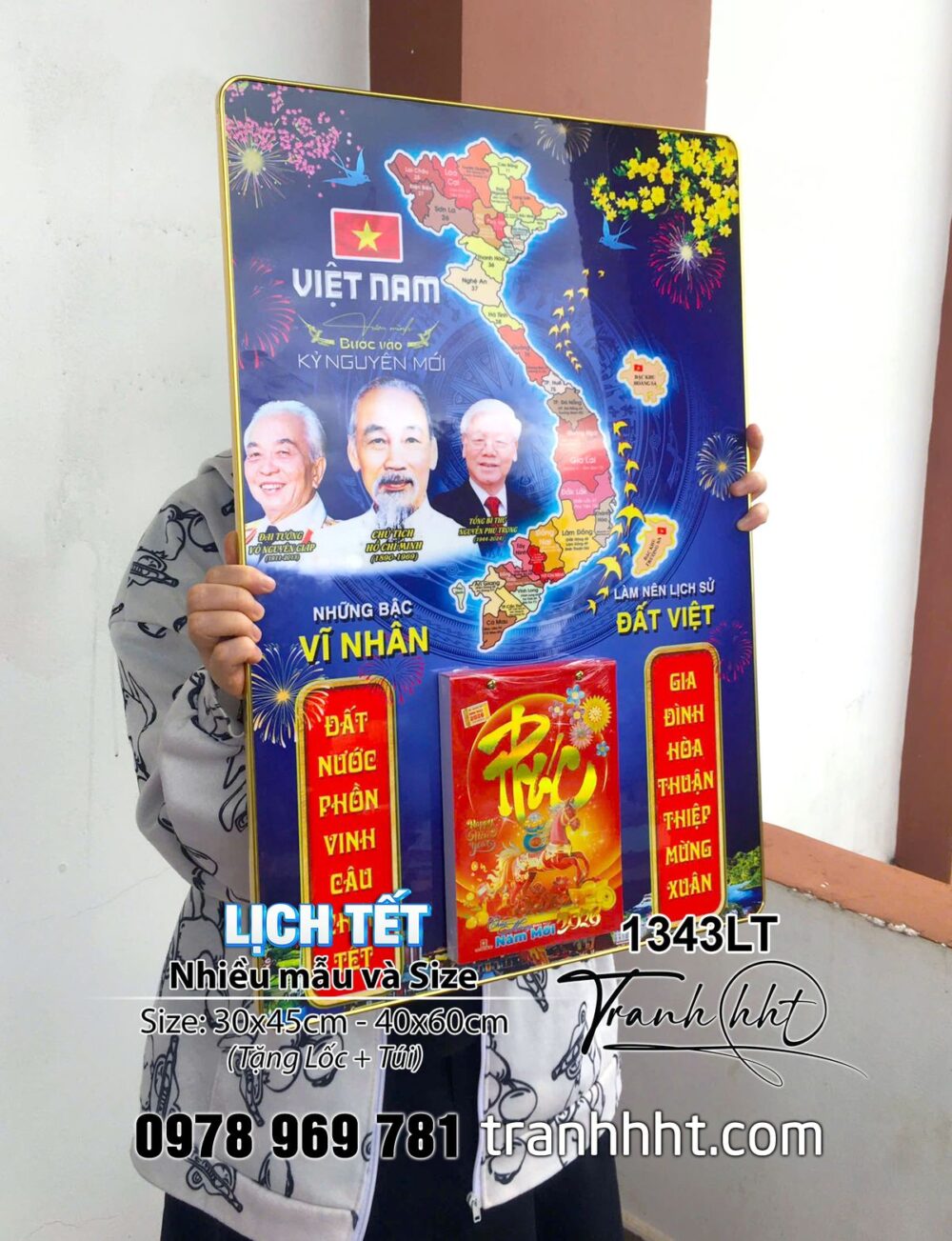 Đặt mua Khung tranh Lịch bản đồ việt nam, Lịch Tết bản đồ 34 tỉnh, bản đồ Việt Nam, bác Hồ, bác Giáp, bác Trọng kính yêu, Lịch Tết 2026, Đốc Lịch Tết, Lịch bloc - Lịch gỗ tráng gương bác Hồ 2026 1343LT