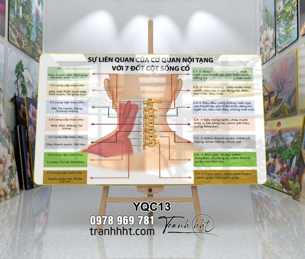 Khung tranh Y Khoa, tranh cơ xương khớp, Tranh Y khoa sự liên quan của cơ quan nội tạng với bảy đốt sống cổ tráng gương treo tường YQC13