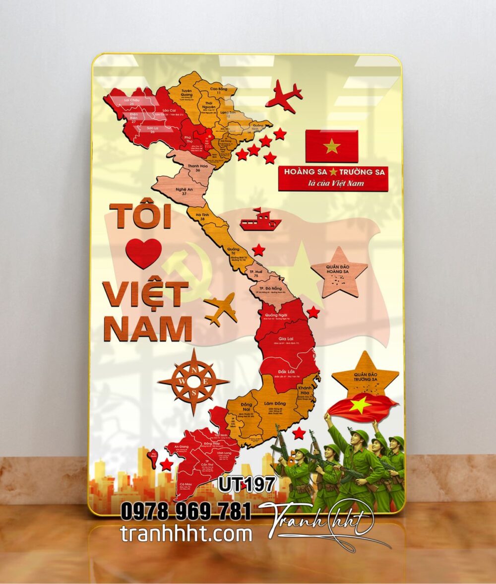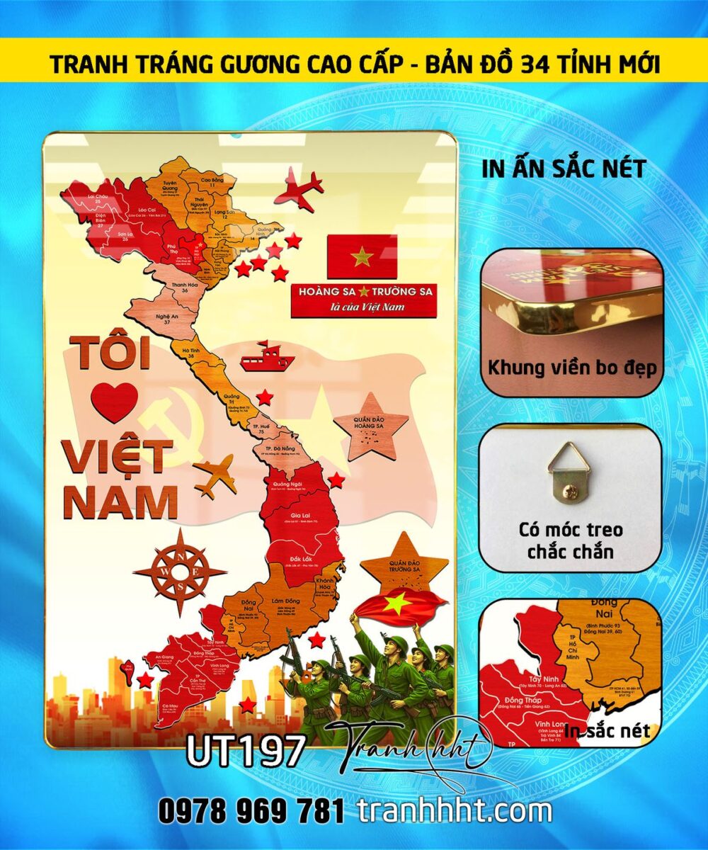 Tranh bản đồ việt nam, bản đồ Việt Nam 34 tỉnh, tranh Việt Nam Tôi yêu Việt Nam tráng gương UT197