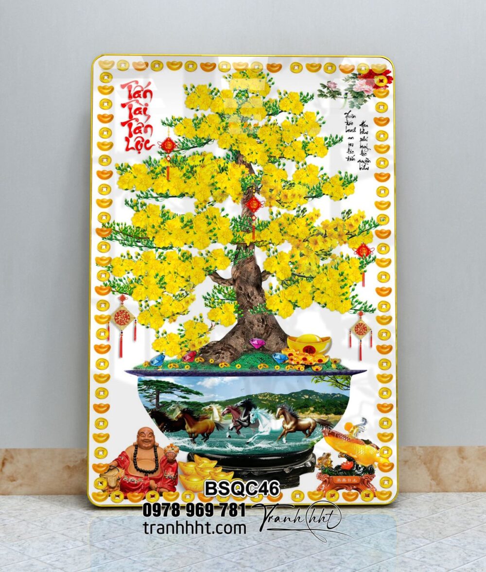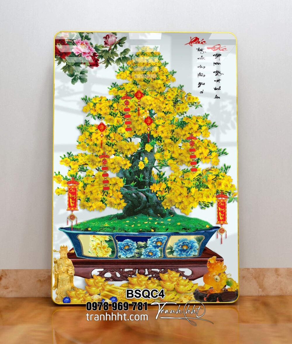 Tranh bonsai chậu mai vàng 3d tráng gương treo tường, tranh tráng gương treo tường, Tranh Bonsai Tết mai vàng phú quý tráng gương treo tường BSQC4