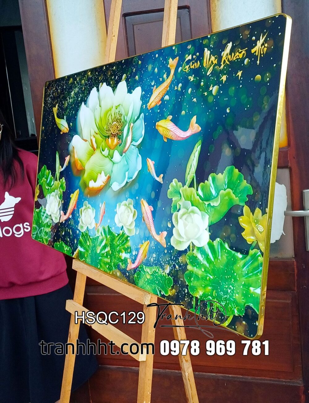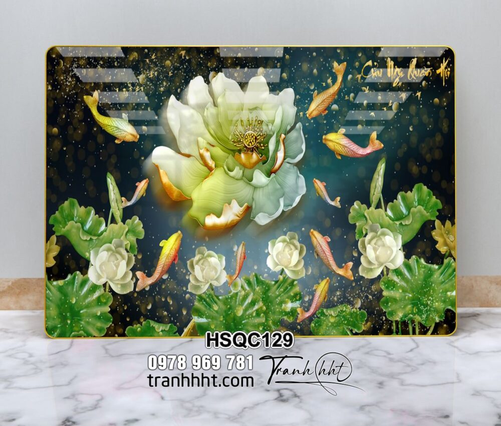 Tranh hoa sen cá chép cá koi hoa sen ngọc ngà tráng gương treo tường HSQC129