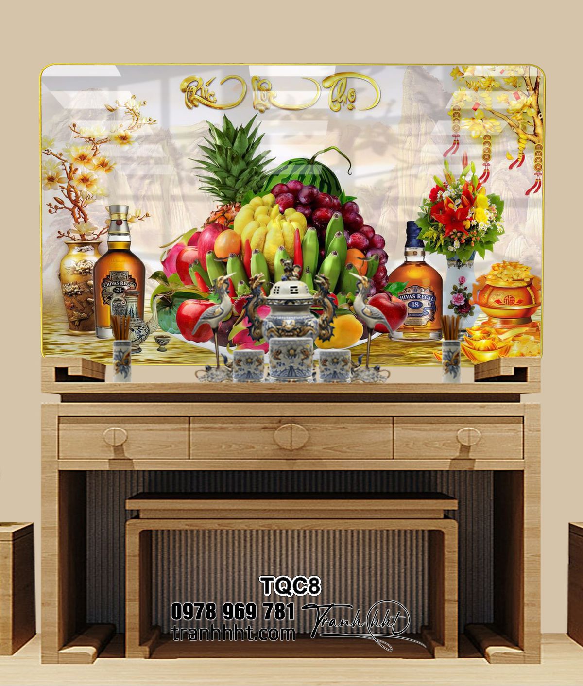 Tranh mâm ngũ quả, tranh phúc lộc thọ, tranh phòng thờ, Tranh treo tường phòng thờ tri ân tổ tiên tráng gương TQC8