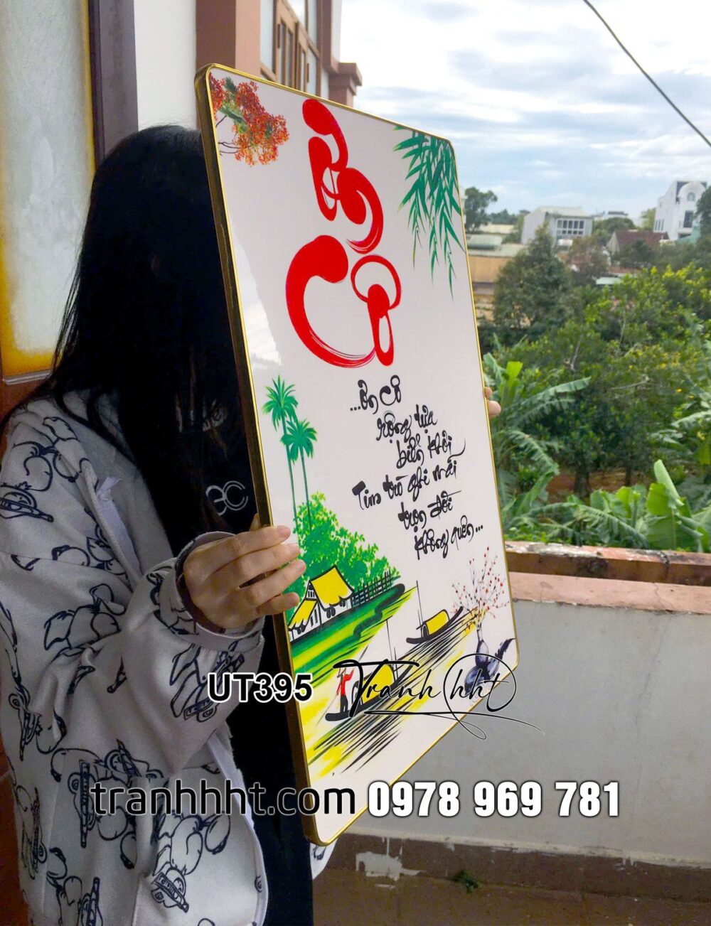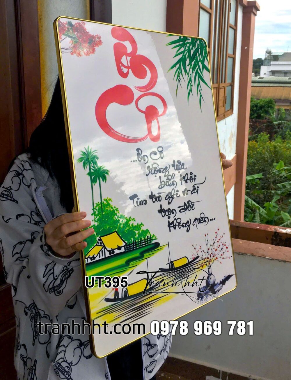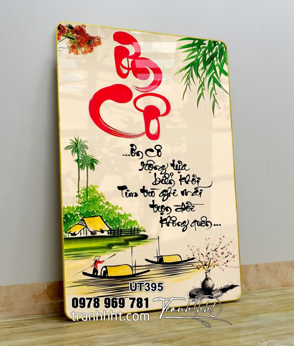 Tranh nhà giáo việt nam 20 tháng 11, tranh thư pháp tri ân cội nguồn, tranh chữ thư pháp dòng sông bên làng quê tráng gương treo tường UT395