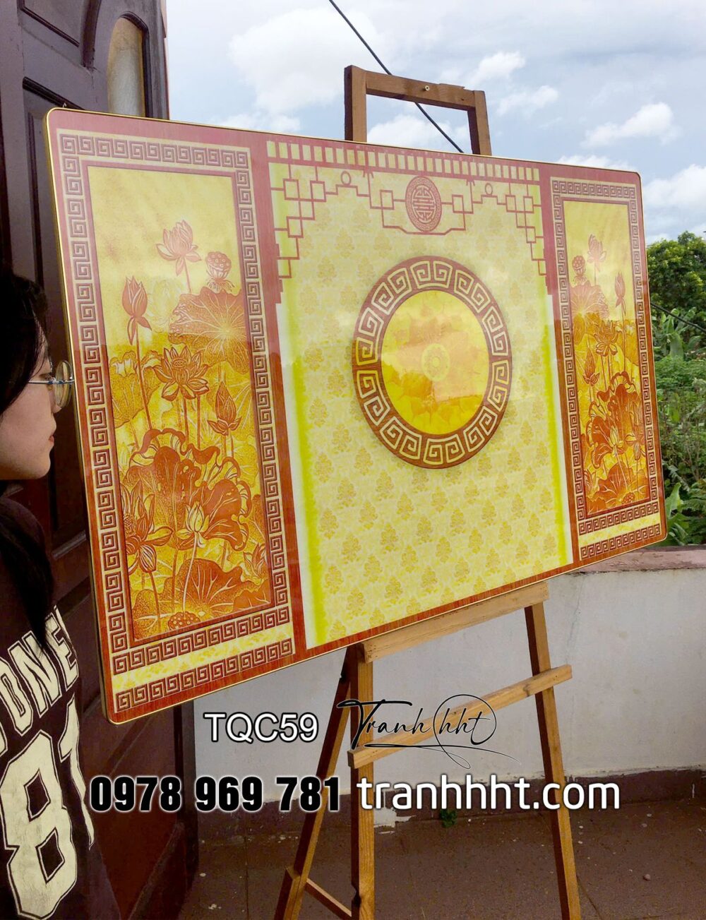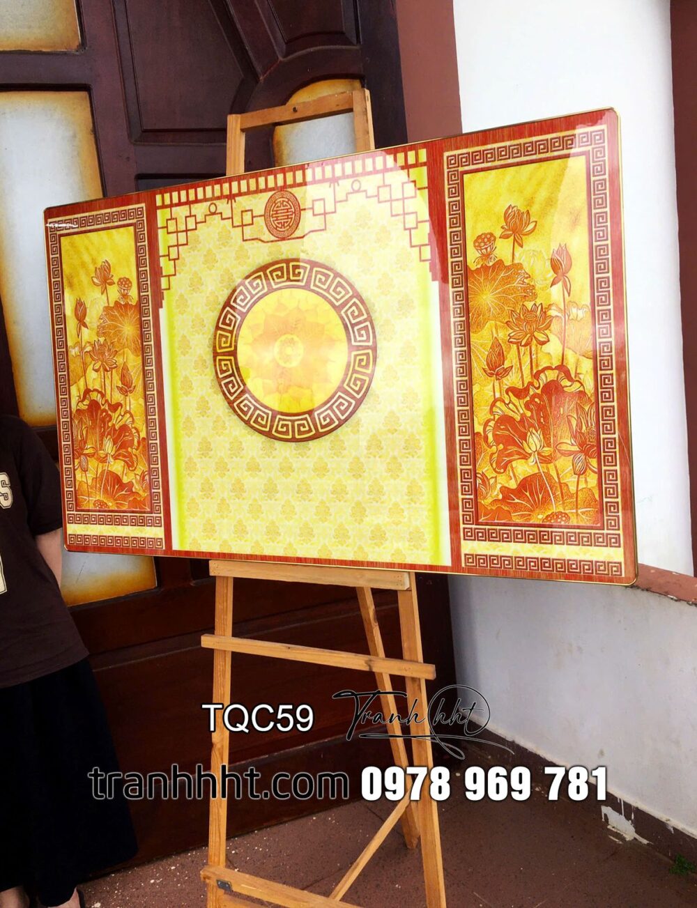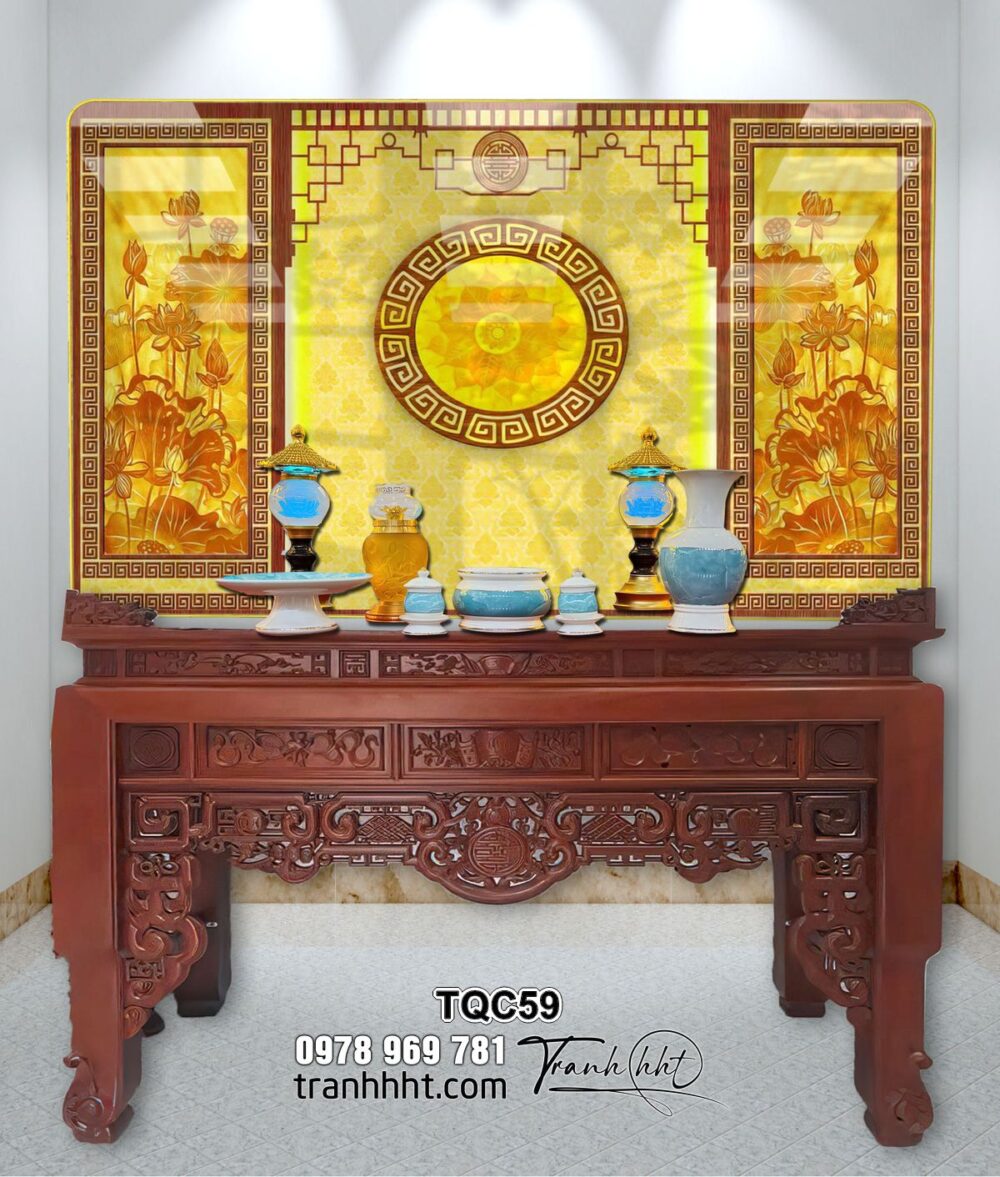 Tranh phòng thờ trúc chỉ in 3d, tranh thờ tổ tiên, Tranh treo tường phòng thờ hoa văn sen trên phông tráng gương TQC59